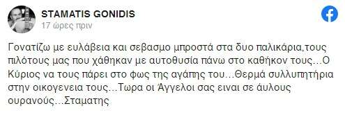 «Γονατίζω με ευλάβεια και σεβασμό μπροστά στα δυο παλικάρια, τους πιλότους μας που χάθηκαν με αυτοθυσία πάνω στο καθήκον τους… Ο Κύριος να τους πάρει στο φως της αγάπης του… Θερμά συλλυπητήρια στην οικογένειά τους… Τώρα οι Άγγελοι σας είναι σε άυλους ουρανούς… Σταμάτης».