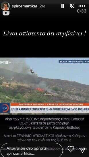 «Την Τρίτη 25 Ιουλίου 2023 και ώρα 14:52 αεροσκάφος τύπου CL-215 της 355 Μοίρας Τακτικών Μεταφορών της 112 Πτέρυγας Μάχης, κατέπεσε, κατά τη διάρκεια αεροπυρόσβεσης, στον Πλατανιστό Ευβοίας με συνέπεια τον θανάσιμο τραυματισμό του κυβερνήτη, Σμηναγού (Ι) Χρήστου Μουλά, 34 ετών και του συγκυβερνήτη, Ανθυποσμηναγού (Ι) Περικλή Στεφανίδη, 27 ετών», αναφέρει η επίσημη ανακοίνωση του Γενικού Επιτελείου Αεροπορίας