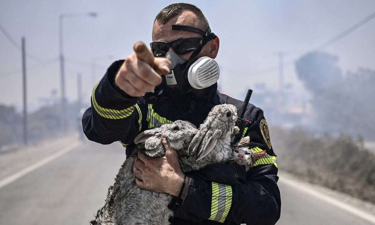 Οι δυνάμεις πυρόσβεσης και εθελοντών δίνουν μια συγκλονιστική μάχη σε όλα τα μέτωπα της πυρκαγιάς. Χαρακτηριστική είναι η φωτογραφία που δείχνει έναν πυροσβέστη να κρατάει σφιχτά στην αγκαλιά του, τα ζωάκια και να τα απομακρύνει από την πυρκαγιά.