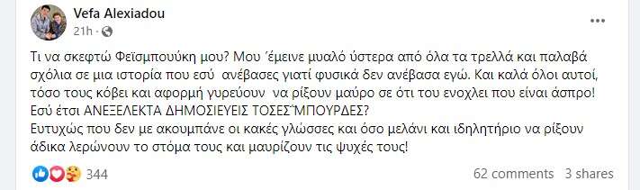 “Τι να σκεφτώ Φεϊσμπούκη μου? Μου έμεινε μυαλό ύστερα από όλα τα τρελά και παλαβά σχόλια σε μια ιστορία που εσύ ανέβασες, γιατί φυσικά δεν ανέβασα εγώ. Και καλά όλοι αυτοί, τόσο τους κόβει και αφορμή γυρεύουν να ρίξουν μαύρο σε ό,τι τους ενοχλεί, που είναι άσπρο! Εσύ έτσι ΑΝΕΞΕΛΕΓΚΤΑ ΔΗΜΟΣΙΕΥΕΙΣ ΤΟΣΕΣ ΜΠΟΥΡΔΕΣ?
