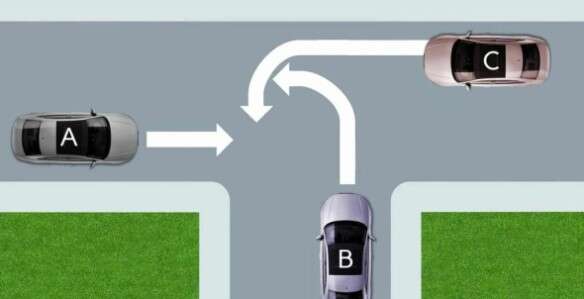 Σε ενδεχόμενη λοιπόν διασταύρωση «Τ» τριών αυτοκινήτων όπου δεν υπάρχουν πινακίδες ή φανάρια, κανένας από τους δύο δρόμους δεν είναι κύριος και κάθε ένα από τα αυτοκίνητα θέλει να ακολουθήσει την πορεία που υποδεικνύουν τα βέλη, η απάντηση είναι «B-A-C».