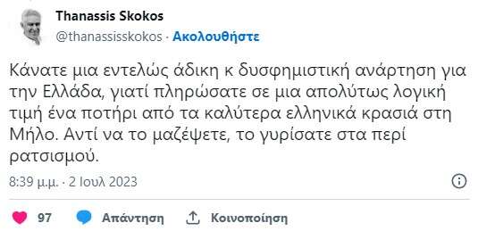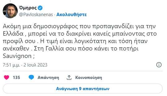 Ενώ κατά καιρούς προκαλούν έκπληξη κάποιες τιμές που ακούμε για Μύκονο και Σαντορίνη αυτή την φορά, θύελλα αντιδράσεων έχει προκληθεί από την ανάρτηση μιας δημοσιογράφου στο Twitter. Πιο συγκεκριμένα, η Yannick Pasquet σχολίασε την τιμή ενός ποτηριού κρασιού που παρήγγειλε σε ένα μπαρ στη Μήλο και κόστιζε 11 ευρώ. Μια τιμή σχετικά κανονική για τα οικονομικά δεδομένα της χώρας.