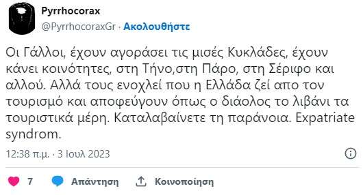 «Καλώς ήρθατε στην Ελλάδα! Και δεν είμαι ούτε στη Μύκονο ούτε στη Σαντορίνη… Ο τουρισμός έχει χάσει τα μυαλά του!» έγραψε η δημοσιογράφος σε tweet της.