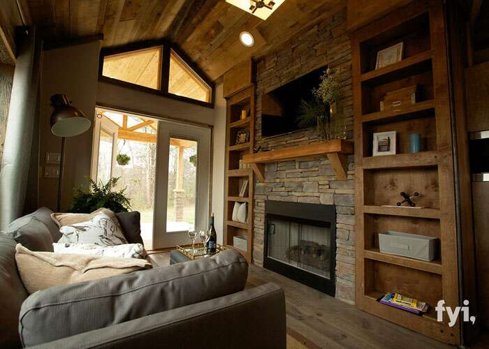 Στο σαλόνι επικρατεί μια πιο τεξανή διακόσμηση, με το τεράστιο πέτρινο τζάκι να δεσπόζει στο χώρο και τα ξύλινα ράφια που καλύπτουν ολόκληρους τους τοίχους στα πλαϊνά του.
