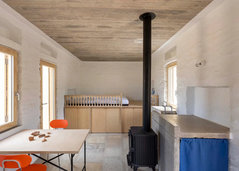 Το δωμάτιο κρατά το αποτύπωμα του προϋπάρχοντος «σταυλιού» και την σχέση του με το τοπίο και ταυτοχρόνως οργανώνει το πλαίσιο για τις διακοπές μιας οικογένειας, προτείνοντας λύσεις για τις βασικές ανάγκες για μια λιτή διαβίωση στην ύπαιθρο. Ένα υπερυψωμένο κρεβάτι – αποθηκευτικός χώρος, ένας νεροχύτης – παράθυρο, μία εστία – πάγκος κουζίνας και ένα ανοιγόμενο λουτρό-ντουλάπα στο «κουτούντο» -τον εξωτερικό διαμπερή χώρο ανάμεσα στην οικία και την επόμενη αναβαθμίδα- που ξυπνά μνήμες του «μέρους» στον κήπο.