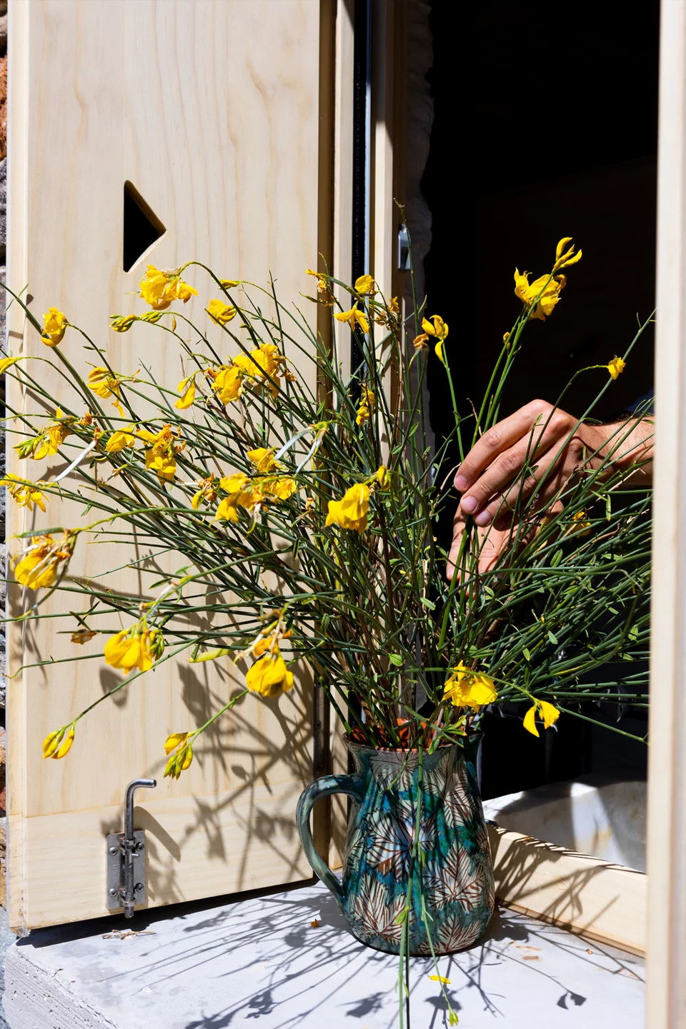 Εξωτερικά κυριαρχεί έντονα το στοιχείο της τραχιάς πέτρας που συναντά την άγρια φύση του τοπίου. Ο κήπος αναπτύσσεται σε ύψος εκμεταλλευόμενος τη συστηματική χρήση από «όχτες», μία σειρά από λίθινους αναβαθμούς που τον δομούν σε οριζόντια επίπεδα, που αλλού απλά επισκευάζονται και αλλού επαναπροσδιορίζονται χρησιμοποιώντας τα υλικά που ήδη υπάρχουν διάσπαρτα.