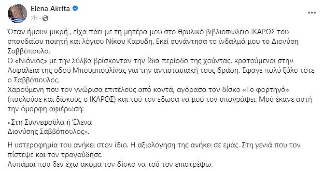 «Η υστεροφημία του ανήκει στον ίδιο. Η αξιολόγηση της ανήκει σε εμάς. Στη γενιά που τον πίστεψε και τον τραγούδησε. Λυπάμαι που δεν έχω ακόμα τον δίσκο να τού τον επιστρέψω», ανέφερε χαρακτηριστικά στην ανάρτησή της και εξιστορεί μία συνάντησή της με τον Διονύση Σαββόπουλο στα νεανικά της χρόνια.