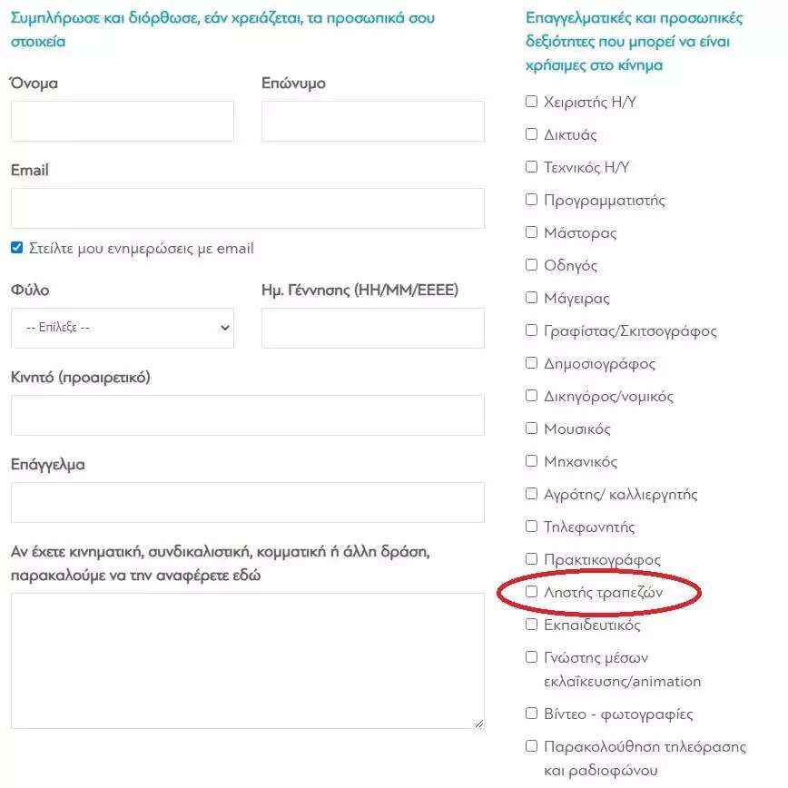 «Ληστής τραπεζών» είναι μία από τις επιλογές που δίνει η «Πλεύση Ελευθερίας» στους υποστηρικτές της, καλώντας τους να δηλώσουν τις επαγγελματικές και προσωπικές δεξιότητές τους.