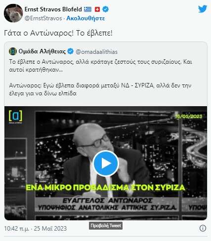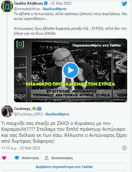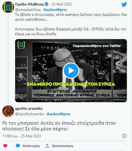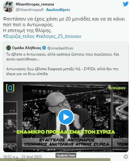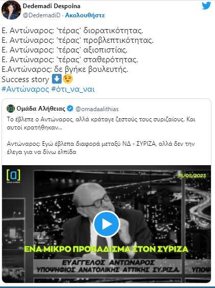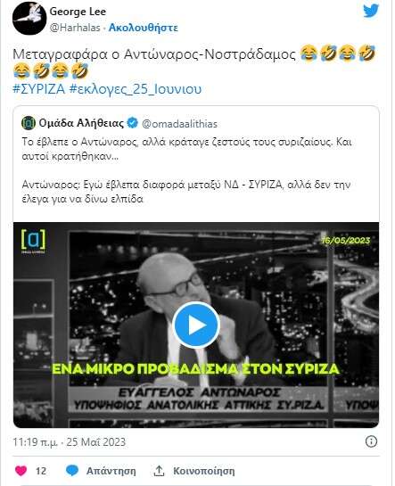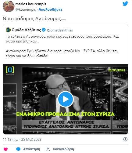 Ήδη, πάντως, η τεευταία αυτή δήλωση του Ευαγγέλου Αντώναρου ο οποίος είχε «δει» την ήττα με διαφορά στις εκλογές αλλά δεν μιλούσε, έχει γίνει αντικείμενο σφοδρού σχολιασμού στο Twitter όπου «βαφτίζεται» Νοστράδαμος.