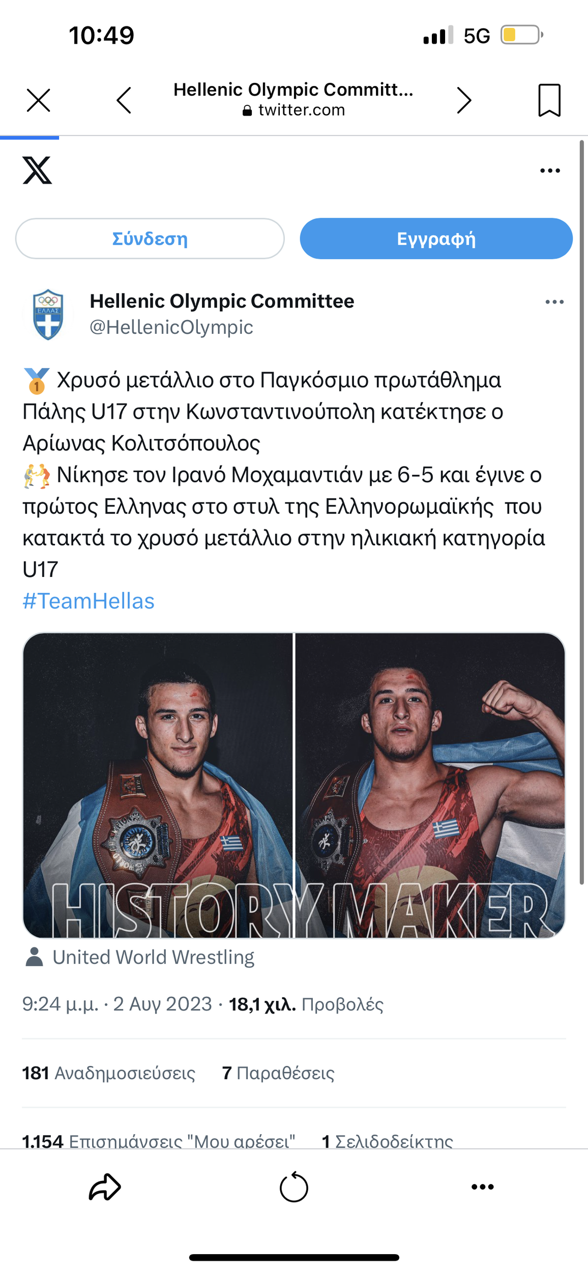 Ο Αρίωνας Κολιτσόπουλος, έγραψε ξανά ιστορία μετά τον περσινό άθλο του, όπου έγινε ο πρώτος Έλληνας αθλητής που είχε στεφθεί πρωταθλητής Ευρώπης στην ελληνορωμαϊκή U17.