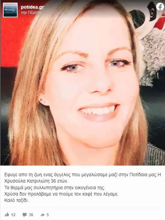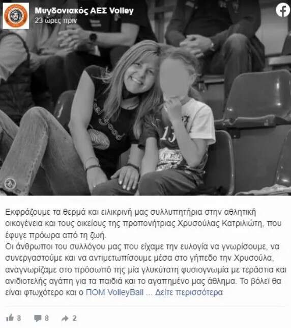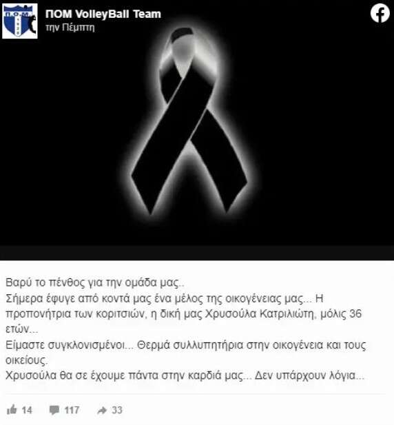 Η προπονήτρια, Χρυσούλα Κατριλιώτη, εργαζόταν στον Παναθλητικό Όμιλο Μουδανιών, ο οποίος και έκανε γνωστή την απώλειά της. Η 36χρονη ήταν ιδιαίτερα αγαπητή και αυτό το αποδεικνύουν τα σπαρακτικά μηνύματα από τον χώρο της ελληνικής πετοσφαίρισης.