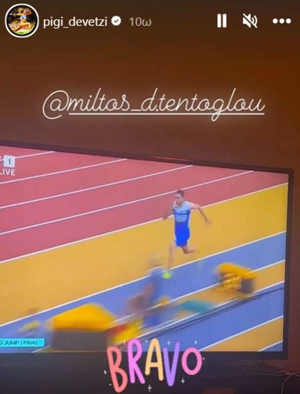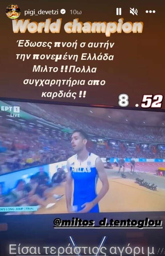 Μετά το χρυσό μετάλλιο που κατέκτησε ο Μίλτος Τεντόγλου, πολλοί Έλληνες αθλητές συνεχάρησαν τον σπουδαίο Έλληνα αθλητή του άλματος. Ανάμεσα τους και η πρωταθλήτρια στον στίβο, Πηγή Δεβετζή.