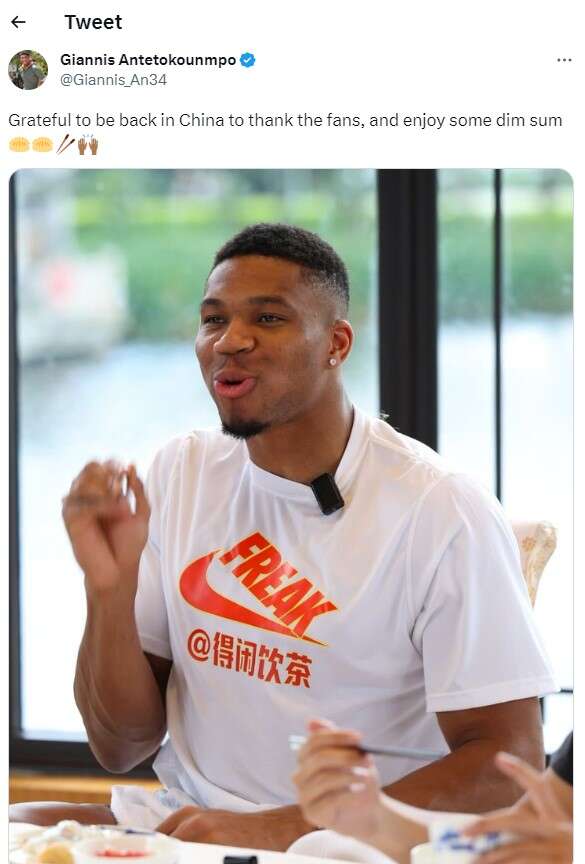 Ο Γιάννης Αντετοκούνμπο δημοσιεύει στα social media στιγμές από το ταξίδι του. Την Τετάρτη (5/7) ανέβασε μια φωτογραφία, όπου απεικονίζεται να απολαμβάνει την κινέζικη κουζίνα.