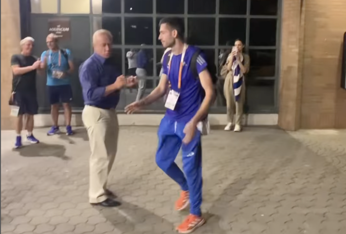 Ο παγκόσμιος πρωταθλητής φαίνεται σε ένα βίντεο που αναρτήθηκε από τον ΣΕΓΑΣ, καθώς πλησιάζει τον κόσμο που έχει συγκεντρωθεί να τον υποδεχτεί, να παρακάμπτει τη χειραψία από τον πρώτο άνθρωπο που τον πλησιάζει και να κατευθύνεται σε ένα άλλο πρόσωπο.