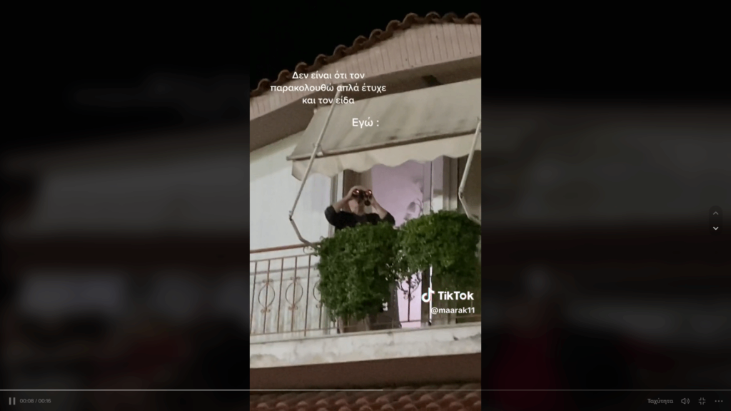 Σε αυτό η viral γιαγιά έχει βγει με τα… εξελιγμένα κιάλι της στο μπαλκόνι του σπιτιού της και αρχίζει την παρακολούθηση της γειτονιάς. Κάτι σύνηθες από τους ηλικιωμένους ανθρώπους της επαρχίας (και όχι μόνο).