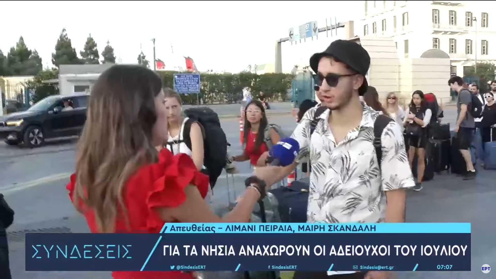 Στο λιμάνι του Πειραιά βρέθηκε η ρεπόρτερ της ΕΡΤ, Μαίρη Σκανδάλη για τις ανάγκες της εκπομπής «Συνδέσεις» και εκεί σταμάτησε μια παρέα νεαρών που ετοιμαζόταν να επιβιβαστεί στο πλοίο.