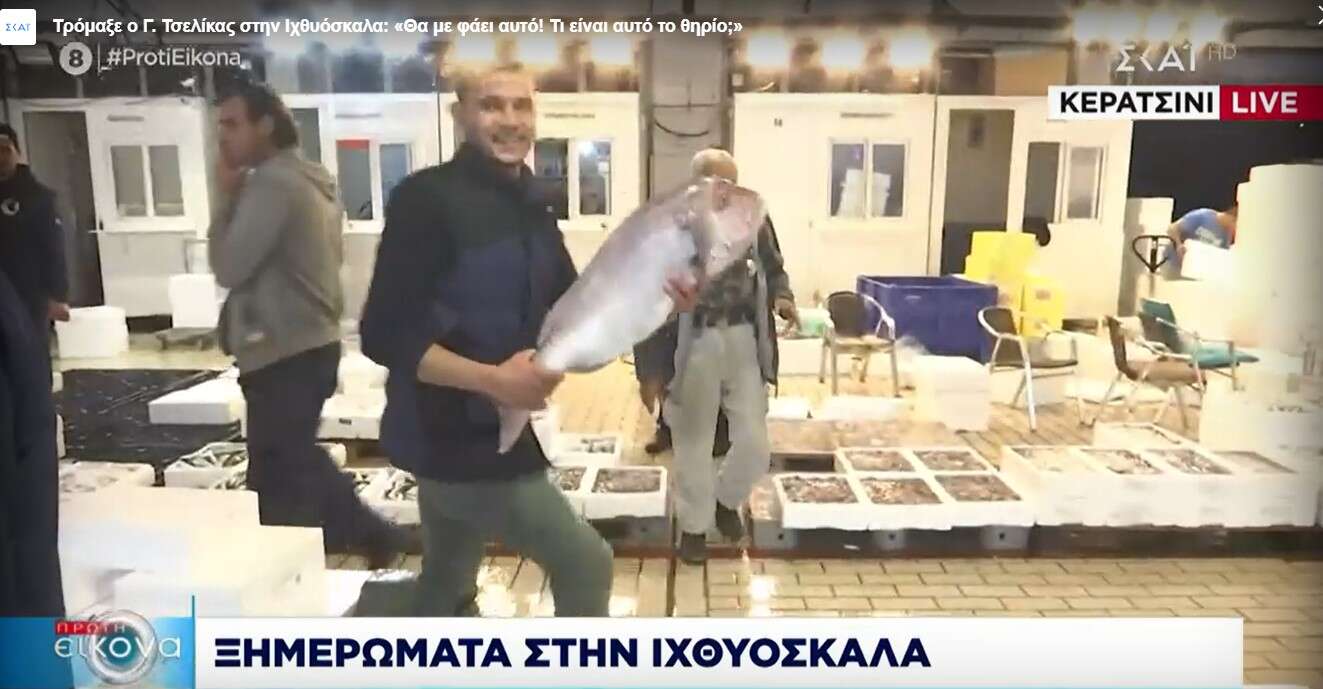 Ο δημοσιογράφος μόλις συνδέθηκε με το στούντιο άρχισε να εκθειάζει την ποικιλία ψαριών που υπήρχε στην ιχθυόσκαλα μέχρι που ένα τεράστιο ψάρι εμφανίστηκε μπροστά του και τον τρόμαξε. Πιο συγκεκριμένα εκείνη τη στιγμή «πετάχτηκε» από πίσω του ένας ψαράς κρατώντας στα χέρια του ένα φαγκρί αρκετών κιλών, με τον Γιώργο Τσελίκα να τα ξαφνιάζεται.