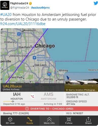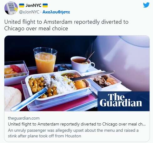 Χαρακτηριστικά η συγκεκριμένη πτήση της United Airlines από το Χιούστον προς το Άμστερνταμ εκτράπηκε στο Σικάγο, εξαιτίας ενός επιβάτη που διέκοψε την πτήση διότι το γεύμα που είχε αρχικά επιλέξει δεν ήταν διαθέσιμο.