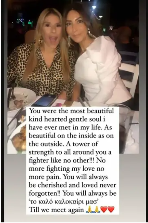 «Ήσουν η πιο όμορφη, καλόκαρδη και ευγενική ψυχή που έχω γνωρίσει στη ζωή μου. Τόσο όμορφη εσωτερικά όσο και εξωτερικά. Mία μαχήτρια σαν καμία άλλη. Όχι άλλη μάχη αγάπη μου, όχι άλλος πόνος. Πάντα θα σε λατρεύουμε και θα σε αγαπάμε, δεν θα σε ξεχάσουμε ποτέ. Θα είσαι πάντα το καλό καλοκαίρι μας. Μέχρι να συναντηθούμε ξανά»