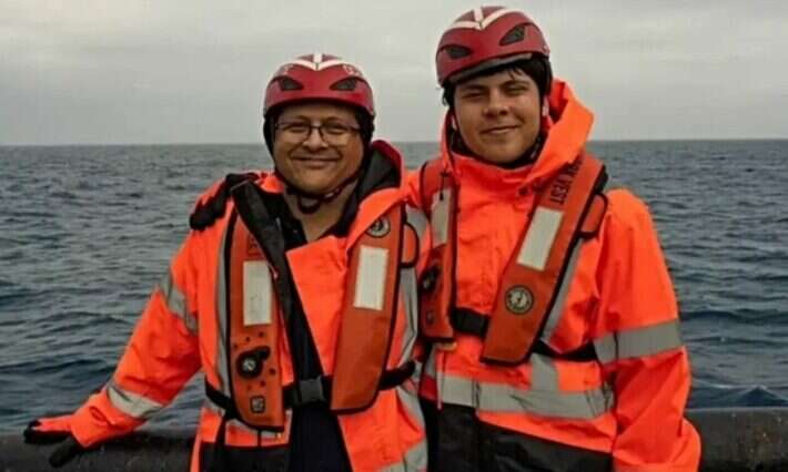 Και οι δύο είναι ντυμένοι για την κατάβαση των δυόμισι ωρών στην παγωμένη άβυσσο στα ανοικτά των ακτών του Newfoundland του Καναδά, με ασορτί ανακλαστικά πορτοκαλί μπουφάν, γιλέκα ασφαλείας, ειδικά γάντια και κράνη.