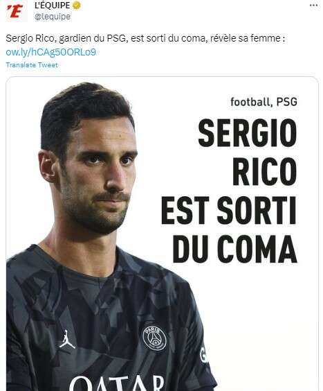 Ευχάριστα είναι τα νέα για την κατάσταση της υγείας του Σέρχιο Ρίκο, του τερματοφύλακα της Παρί Σεν Ζερμέν, ο οποίος ξύπνησε από το κώμα και είναι πλέον εκτός νάρκωσης.